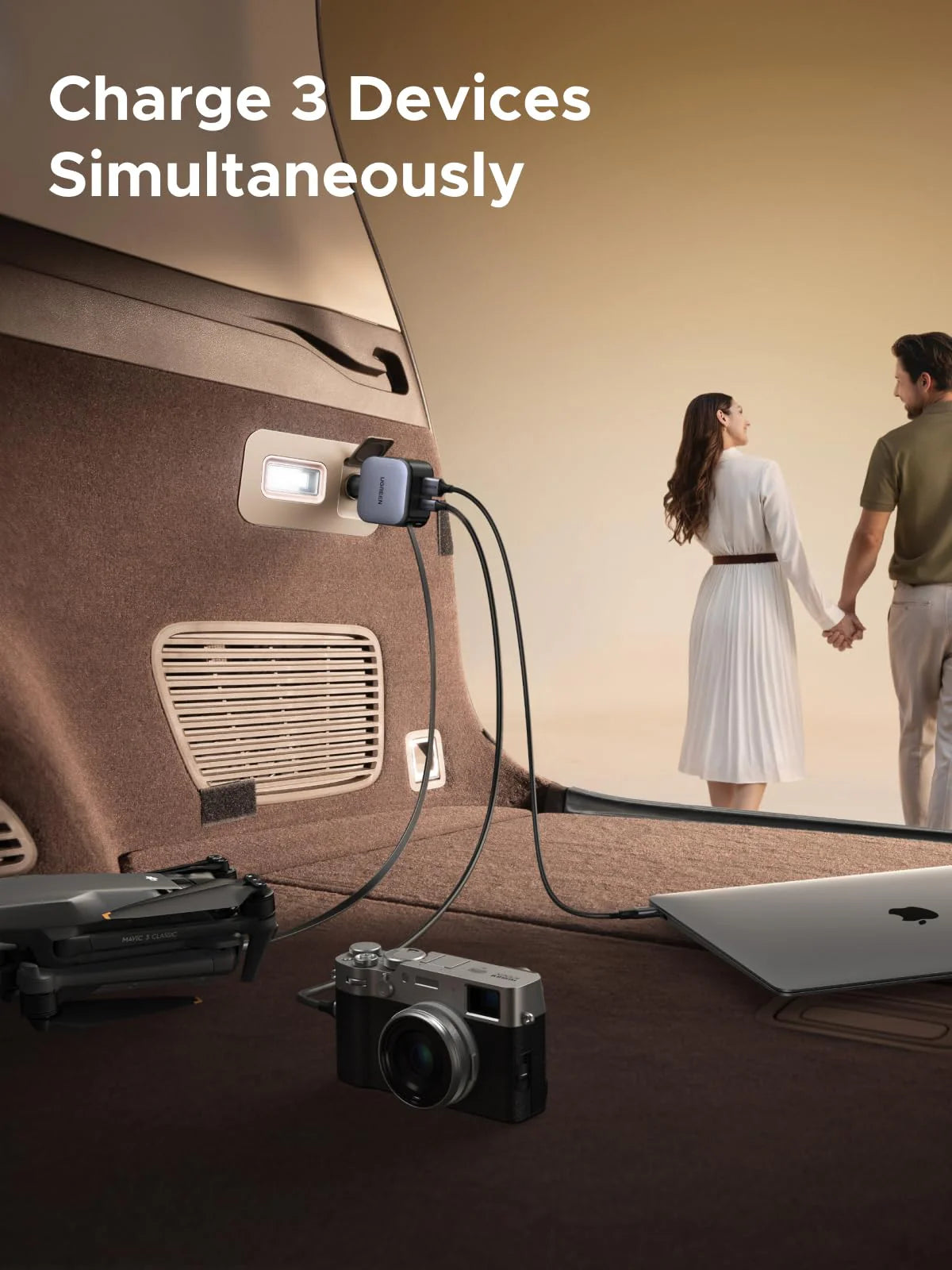 3-in-1 Simultaneous Charging: Includes built-in cable, USB-C port, and USB-A port to charge 3 devices at once.