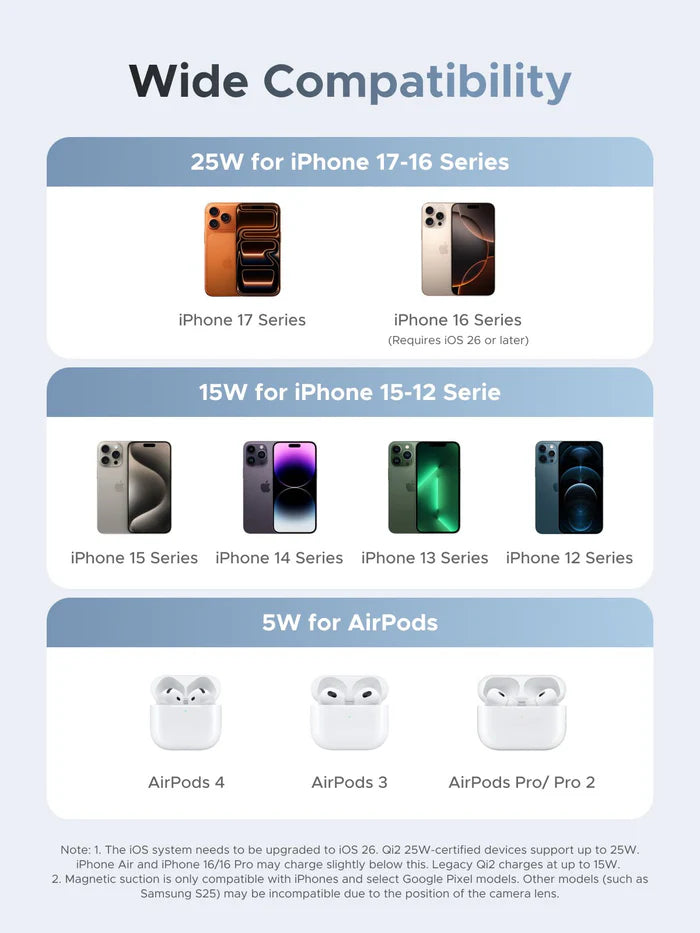 25W Wireless Fast Charge: Qi2-certified power charges iPhone 16 Pro Max to 50% in just 30 minutes.