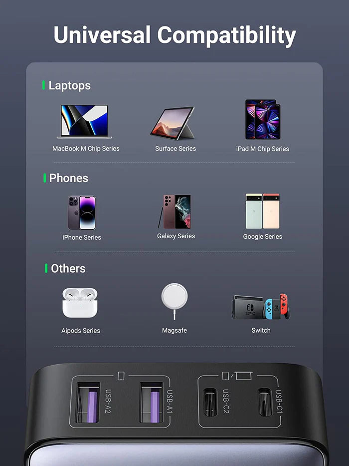 USB-C and 2 USB-A PortGan fast charger, Power Delivery, PPS Super Fast