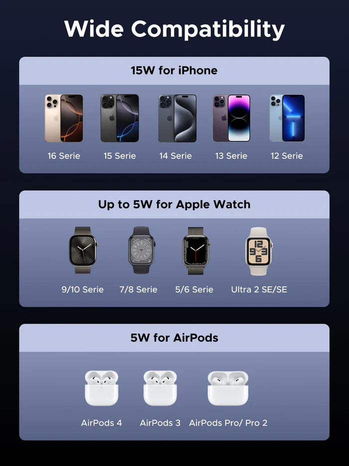 3-In-1 Wireless Charging Station: Charge your iPhone, Apple Watch, and AirPods all at once. Keep your desk or nightstand clutter-free with one compact solution for all your daily charging need
