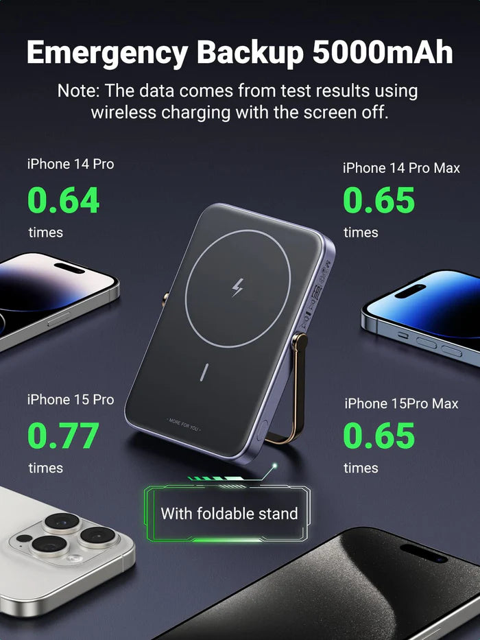 Emergency Backup 5000 mAh: Wireless power bank provides emergency backup power for your iPhone, it can wirelessly charge an iPhone 15 Pro Max up to 0.65 times, this capacity ensures you can keep your iPhone powered on when away from a wall outlet